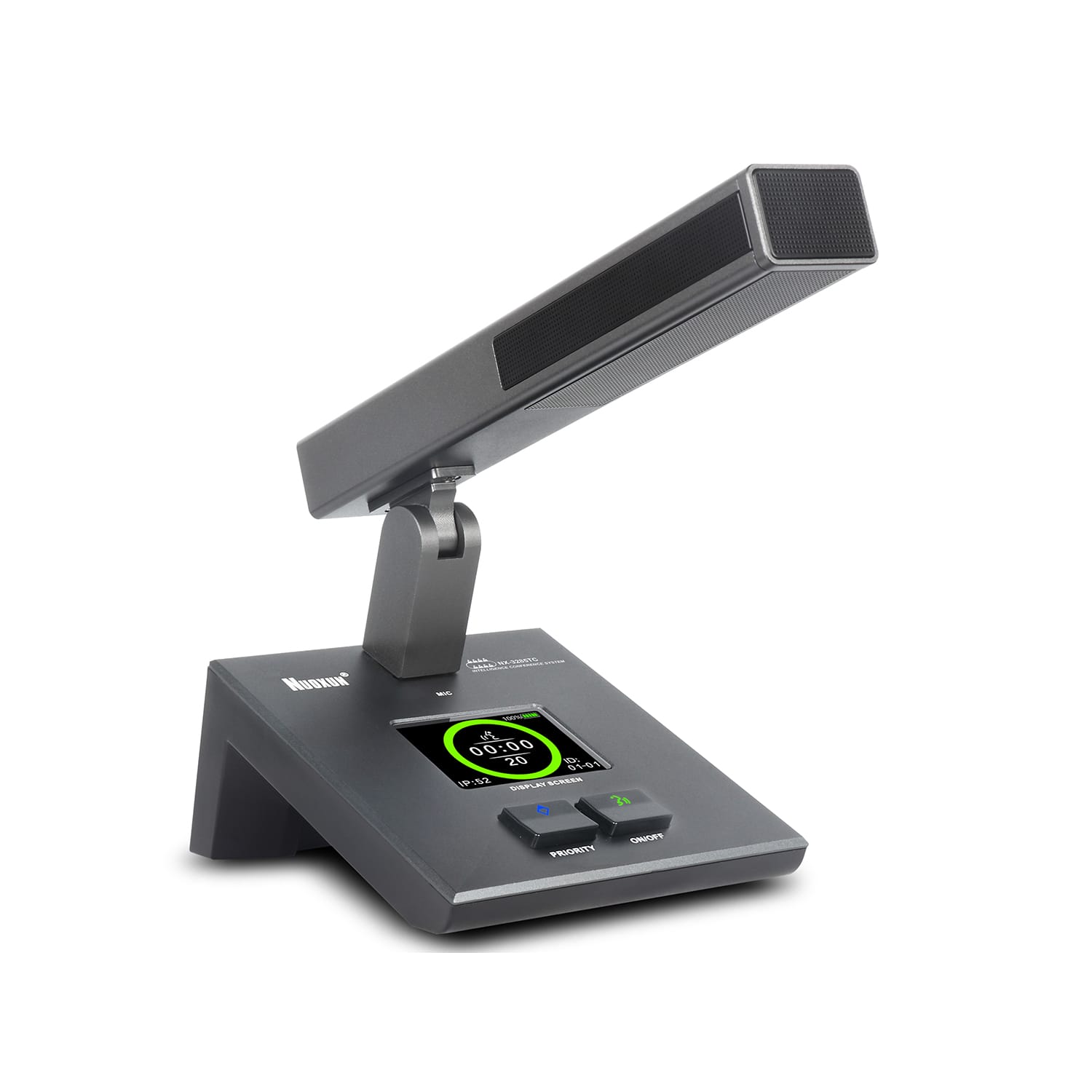 会议单元 功能特点:1.台面可移动式会议座,纯金属铝合金面板,坚固耐用;2.底座采用工程塑料材质表面喷绒处理,外型设计新颖,内置天线,美观得体。3.采用2.5寸TFT彩屏,显示时钟及电池电量,信息显示更直观和人性化。4.固定式金属方型咪杆,高端大气;5.咪杆内置超心···