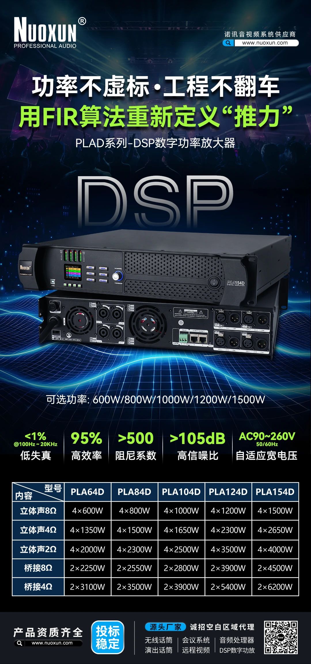 在音频技术飞速发展的今天,一款卓越的功放设备是打造震撼音效的关键。诺讯DSP数字功放,凭借其领先的技术和出色的性能,成为众多音响爱好者和专业人士的理想之选。先进技术,铸就非凡性能PLA154D内置应用灵活的强大算法处理功能,是诺讯DSP数字功放的一大亮点。结合DSP处理:自动FIR、自动EQ、模式矩阵、智能声场校准、多模···