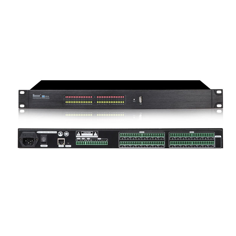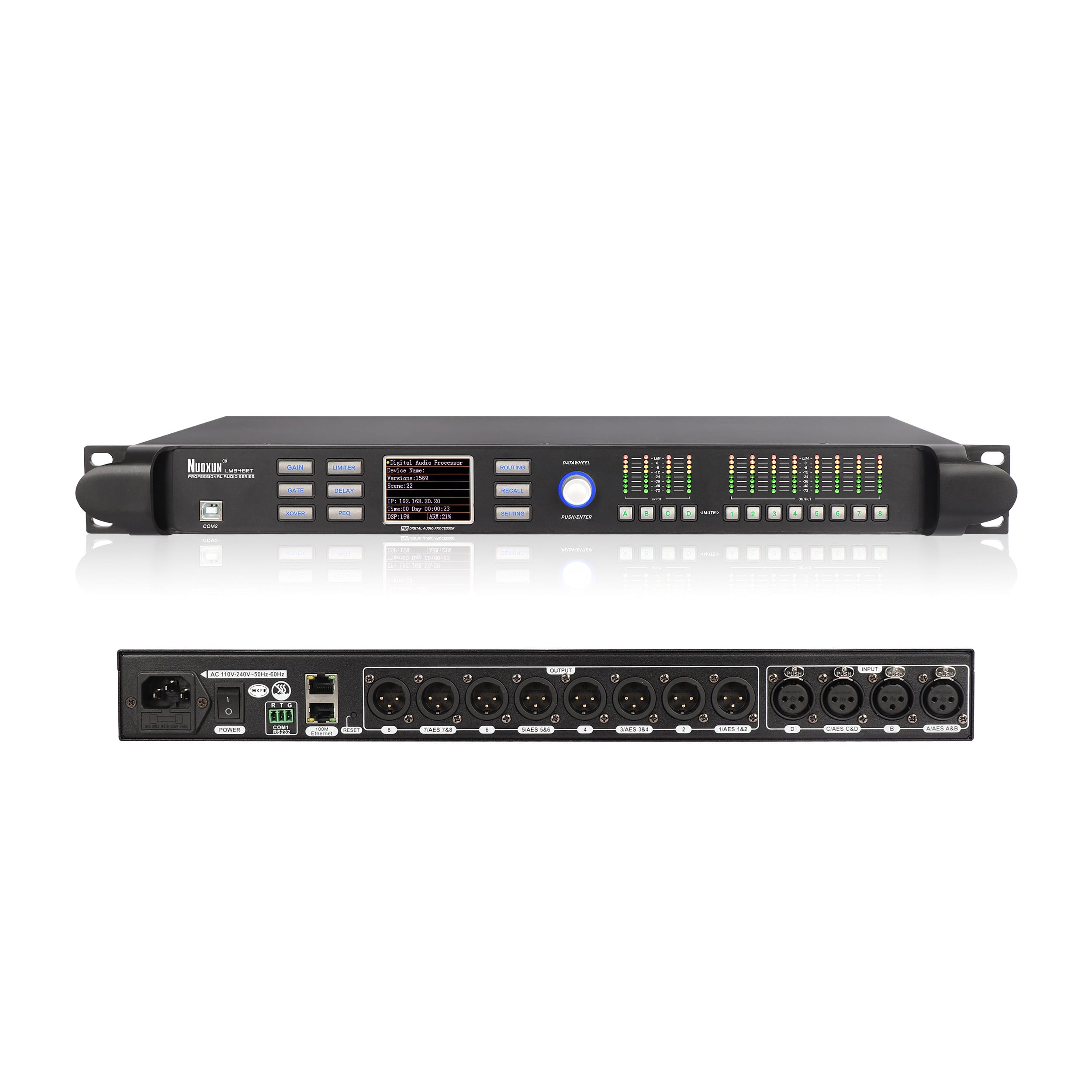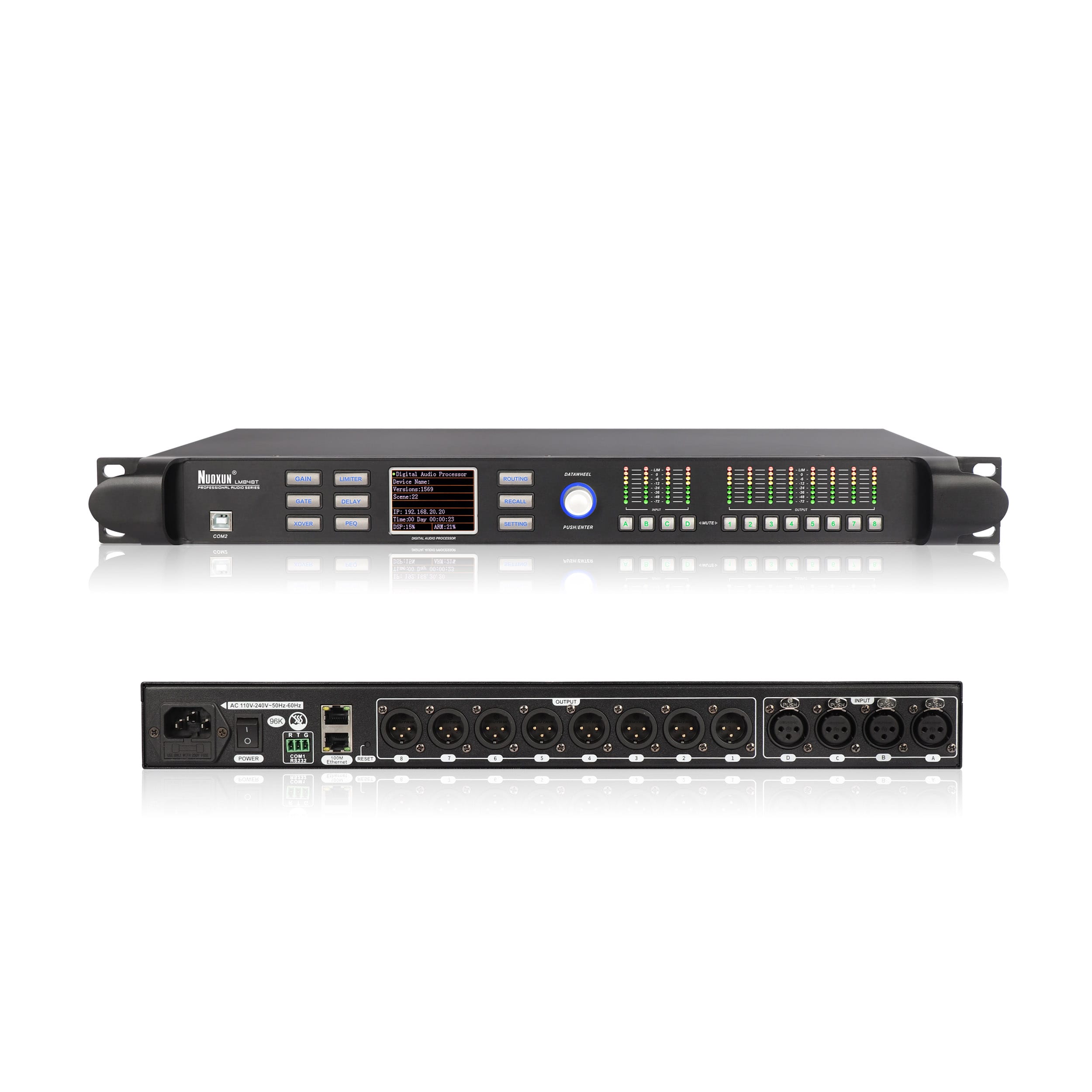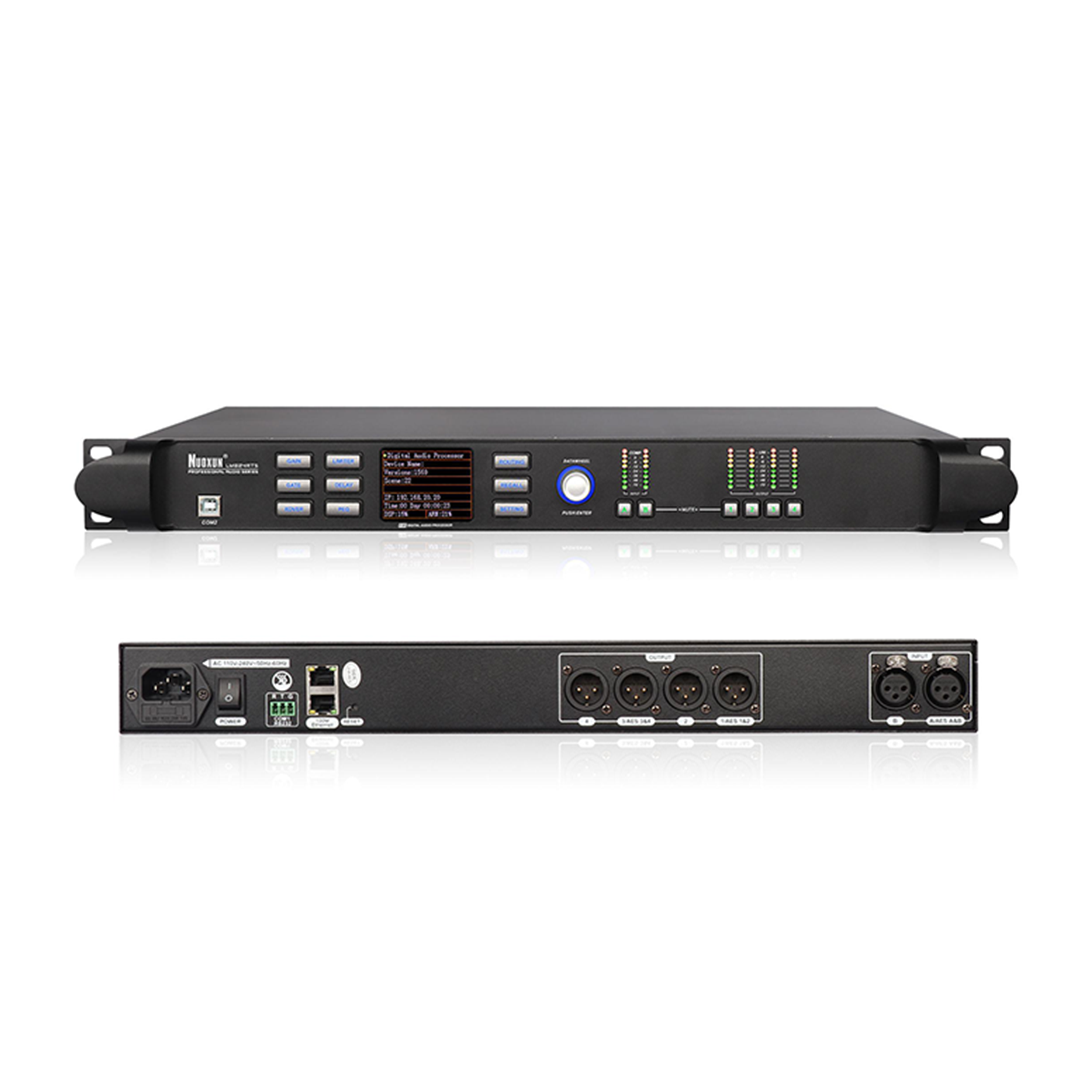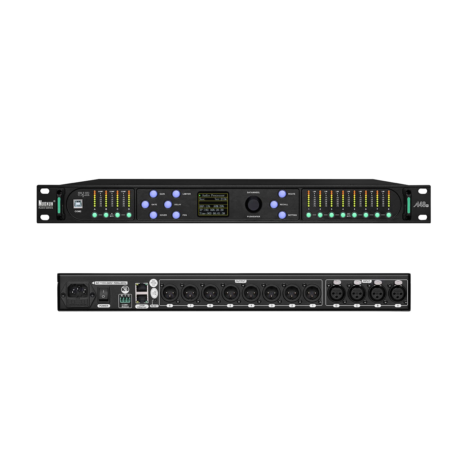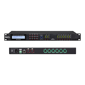 功能特点: 本设备是一款48K采样率的高性能数字音频处理器。由32位ADC/24位DAC模数/数模转换芯片及高速处理DSP芯片来进行对音频的采集与处理。支持4路模拟输入,8路模拟输出。每路输入和输出通道支持11段参数均衡器、配有高低通滤波器、全通滤波器、信号发生器、噪声门···