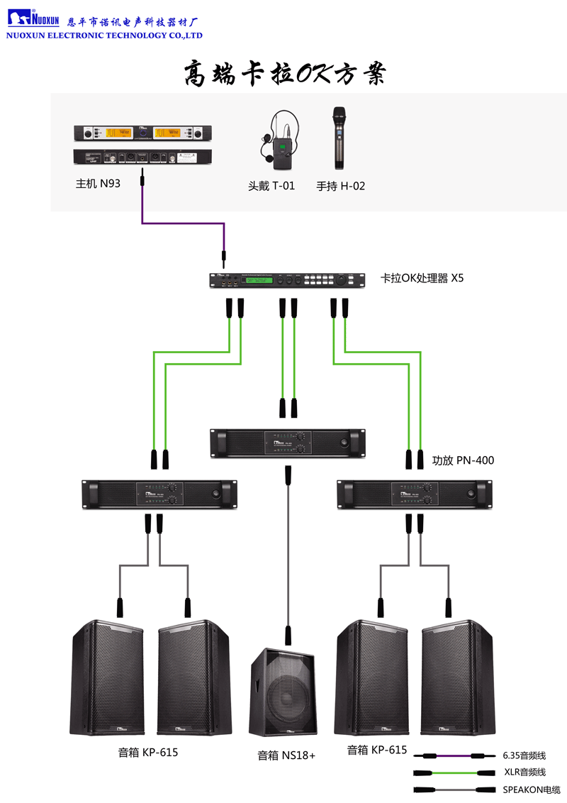 诺讯为KTV豪华包厢提供以下音频系统解决方案,豪华包厢一般面积比较大,需要声场平均和声压足够,我们为大包厢扩音部分提供一对单18寸主音箱NS18+、两对15寸超低音音箱KP-615,与其相对应的是三台400W功放PN-400以及,扩声部分搭配前级效果器X5,能够满足各个豪华型包厢扩音使用,声音效果更为震撼有力。使用起来简单方便,外接点歌机。
