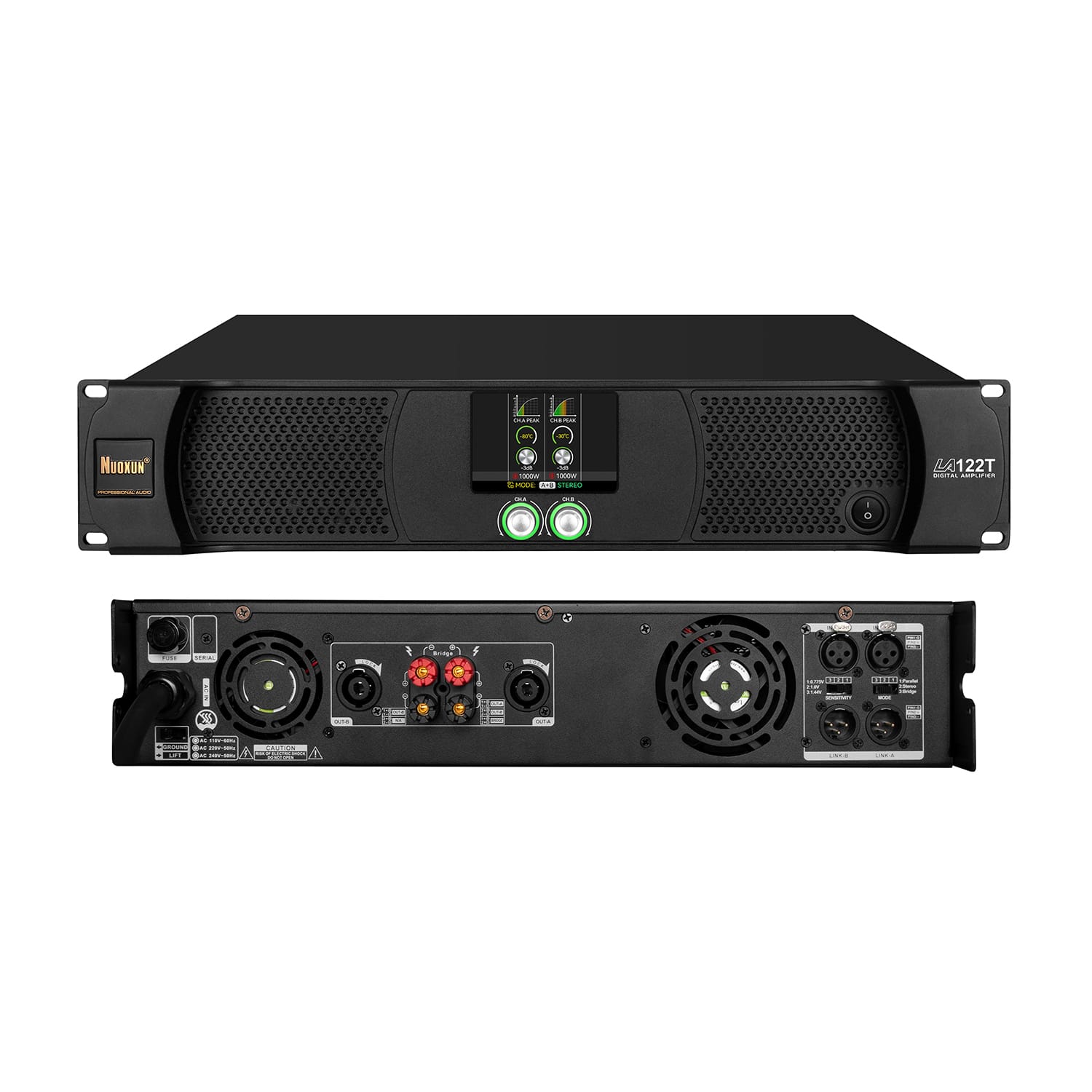 LA系列数字专业功放采用3.5寸彩屏显示款面板;内部功放电路结构是环型变压器+大水塘滤波电源+D类半桥放大输出,这样的电路组合让LA系