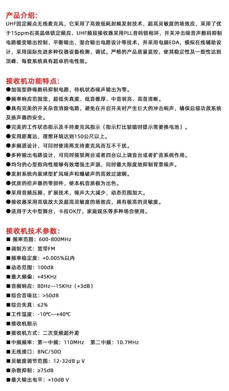 它采用了高效低耗射频发射技术,超高灵敏度的场效应,采用了优于15ppm石英晶体锁定频应,UHF频段接收器采用PLL音码锁相环,开关冲击噪音声数码抑制电路缓变输出控制、平衡输出、混合输出电路设计等技术,并采用电脑EDA,模拟在线辅助设计,采用国际先进多种仪器设备检测、调试。严格的产品质量监控,使其稳定性及一致性达到顶峰、每套系统具有超卓的电性能。