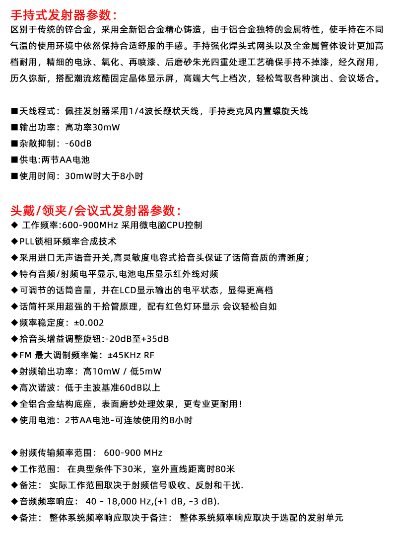 天线程式:佩挂发射器采用1/4波长鞭状天线,手持麦克风内置螺旋天线