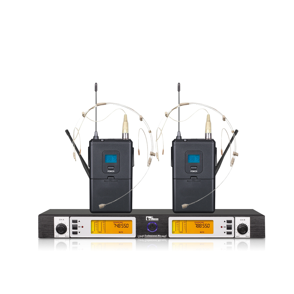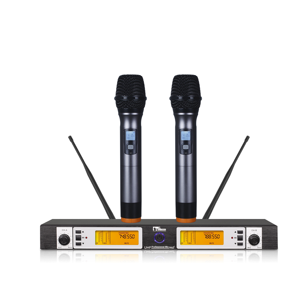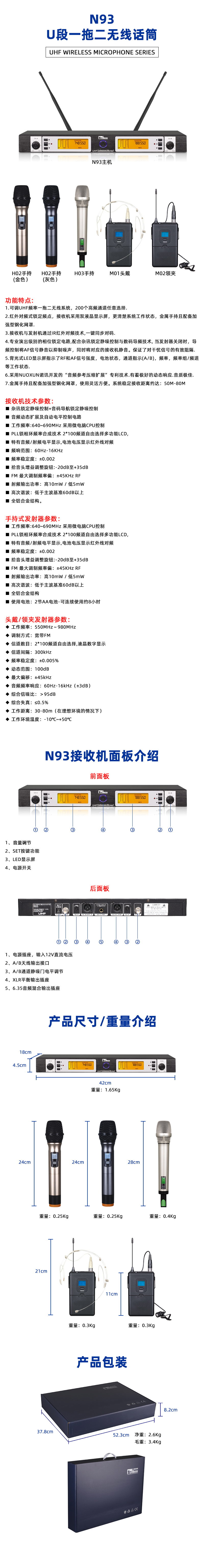 1.可调UHF频率一拖二无线系统,200个高频通道任意选择.
