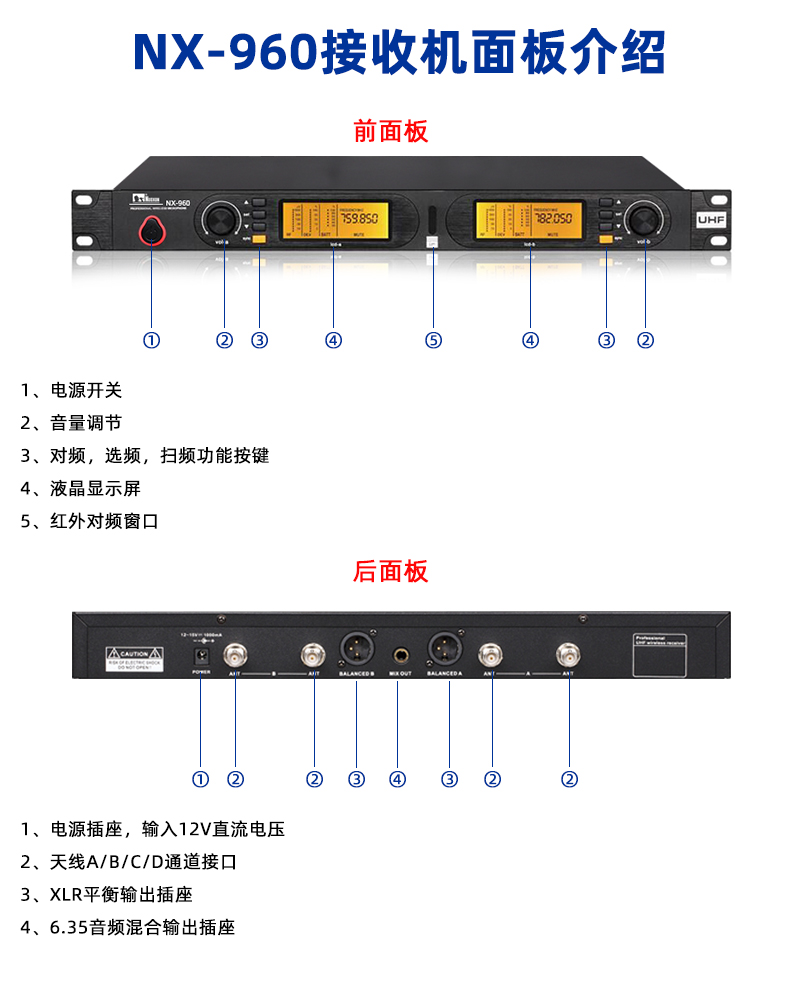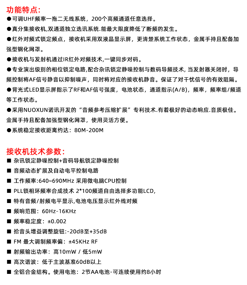 1.可调UHF频率一拖二无线系统,200个高频通道任意选择.
