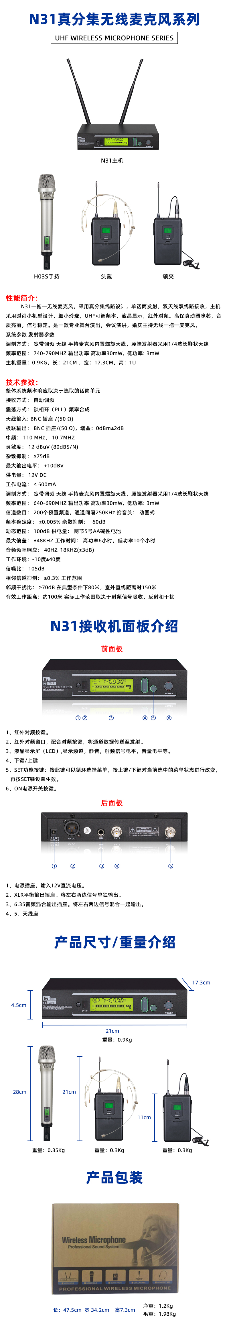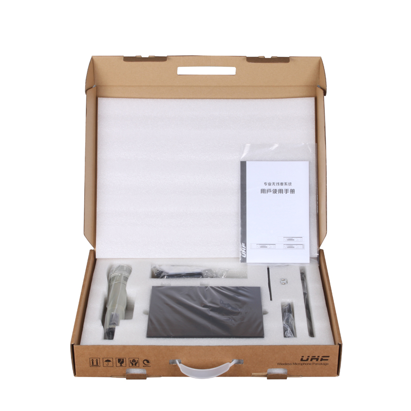 包装清单:无线接收机1台 无线手持话筒1支 天线2根 电池2块 说明书1本 电源1个 角铁2块 保修卡1张