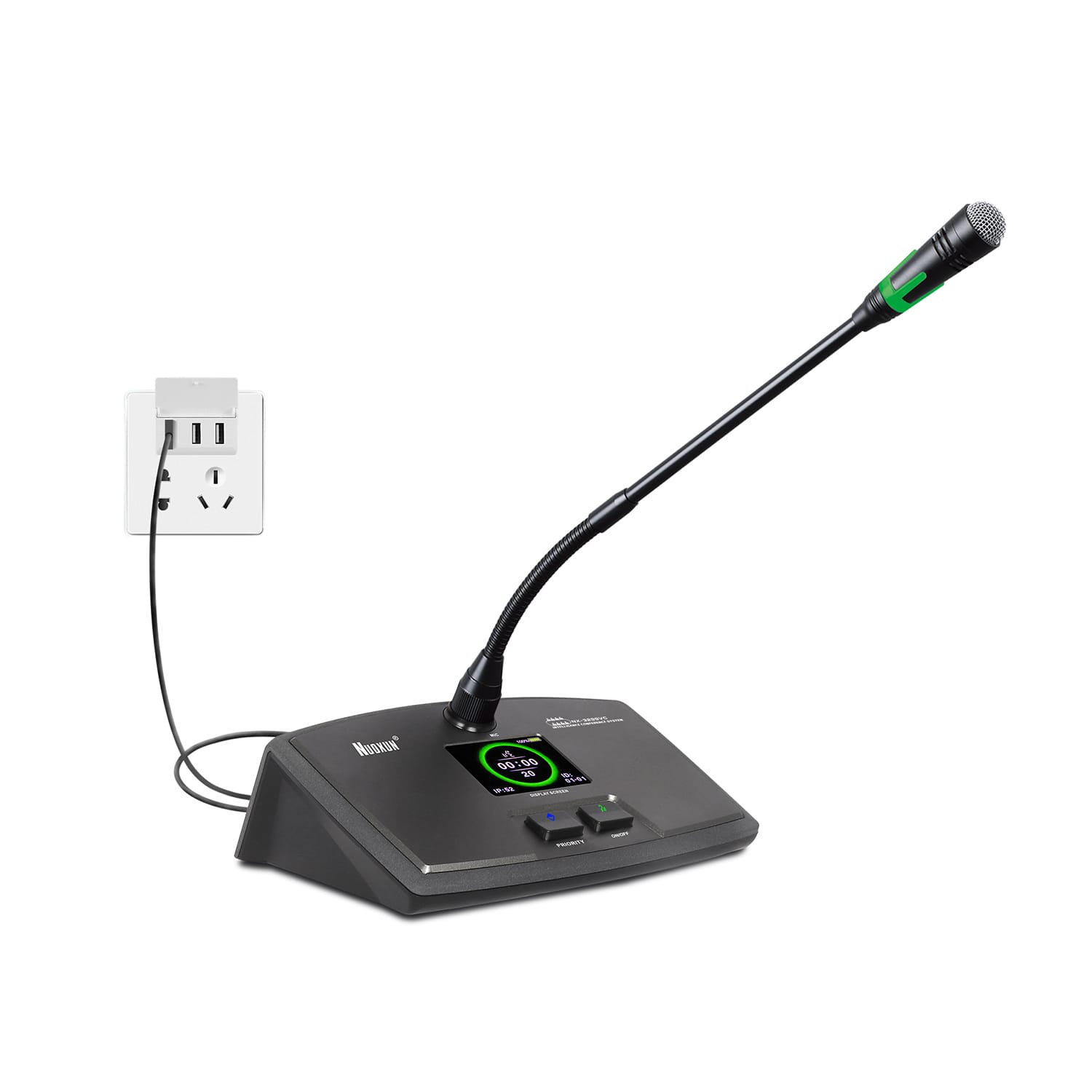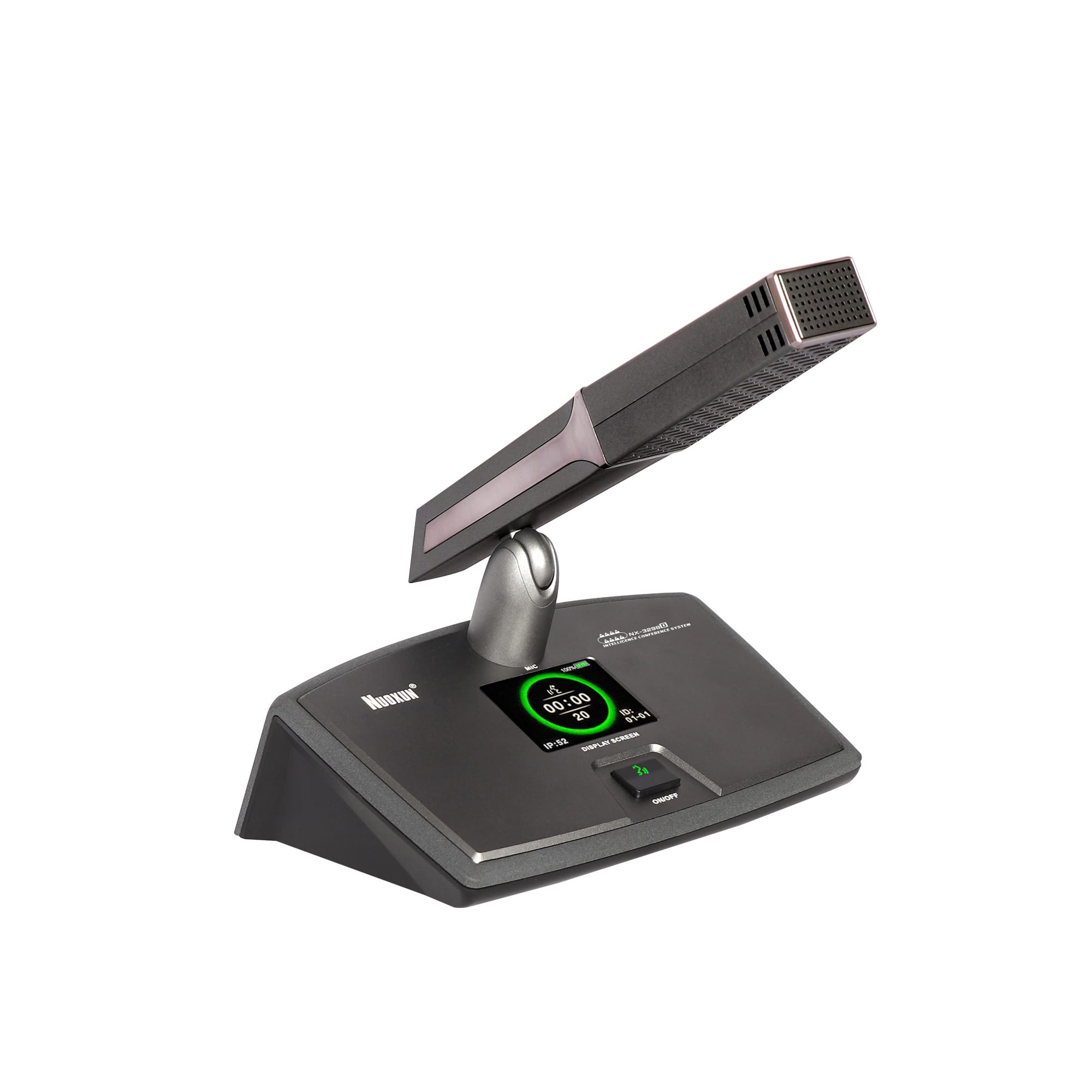 会议单元 功能特点:1.台面可移动式会议座,纯金属铝合金面板,坚固耐用;2.底座采用工程塑料材质表面喷绒处理,外型设计新颖,内置天线,美观得体。3.采用2.5寸TFT彩屏,显示时钟及电池电量,信息显示更直观和人性化。4.固定式金属方型咪杆,高端大气;5.咪杆内置超心···