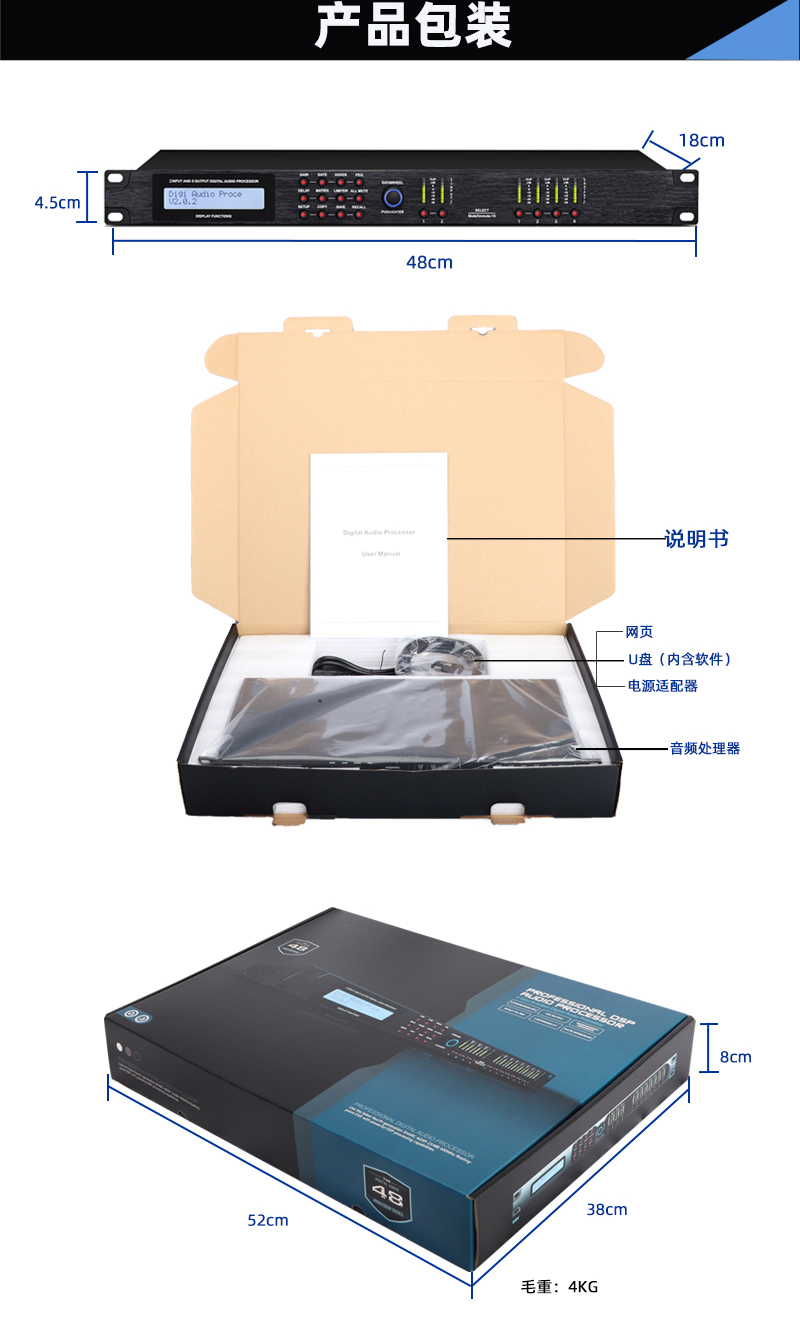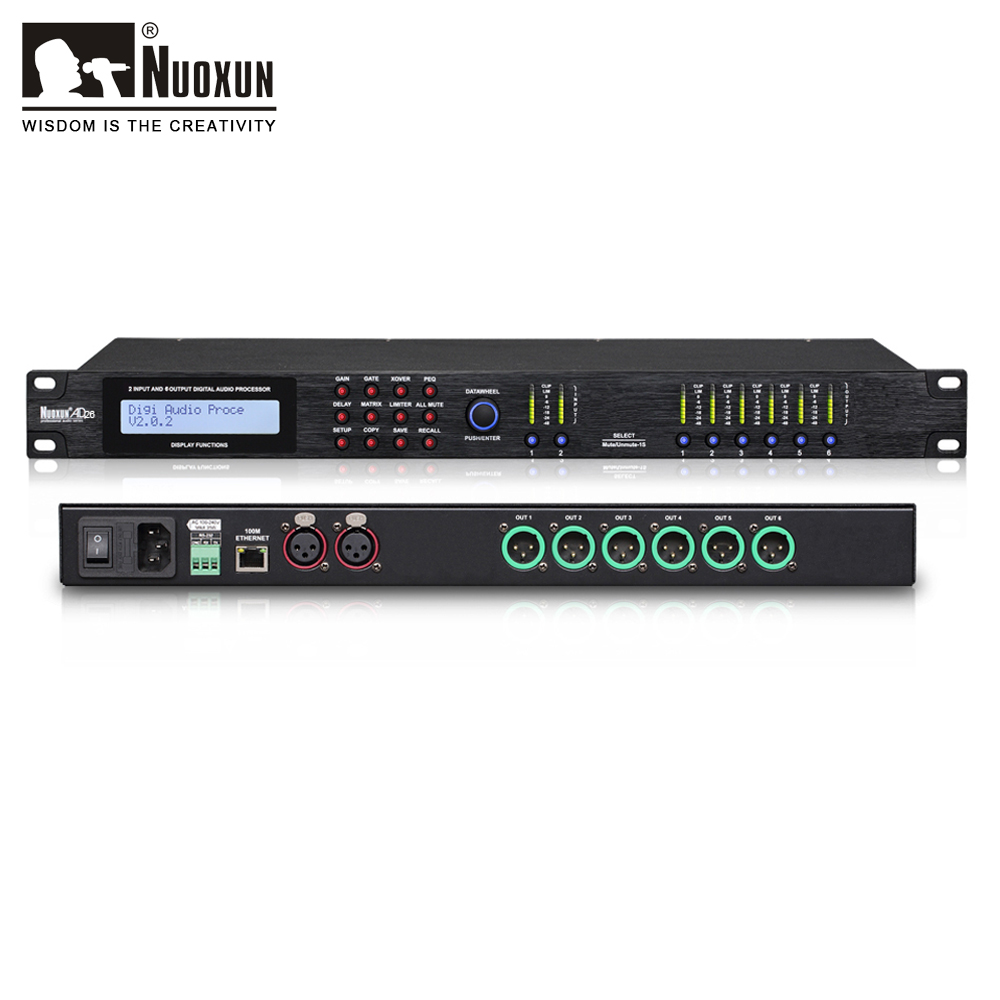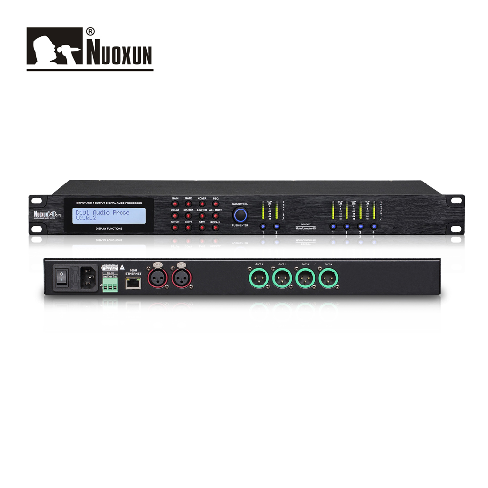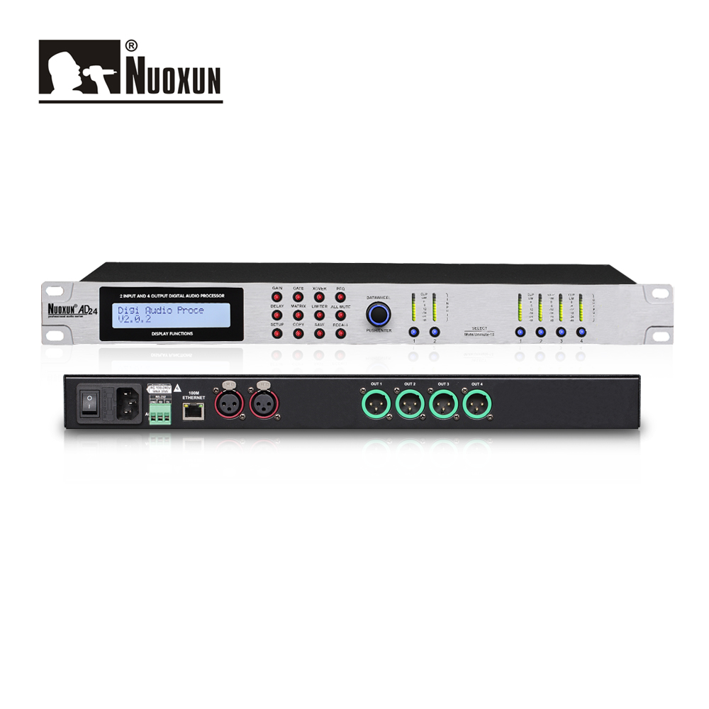 2进4出的音频处理器,使用最新的第四代SHARC ADSP-21488 400Mhz浮点DSP,具有强大的DSP处理能力。每个输入、输出有16段参数滤波器,增益控制、噪声门功能、RMS压限、内置的粉红/白噪声发生器,以及可调的延时。分频器的斜率从6dB/Oct到48dB/Oct范围内可选。延时步进精度0.02ms,电平增益精度0.1dBu,满足现场精细调节。