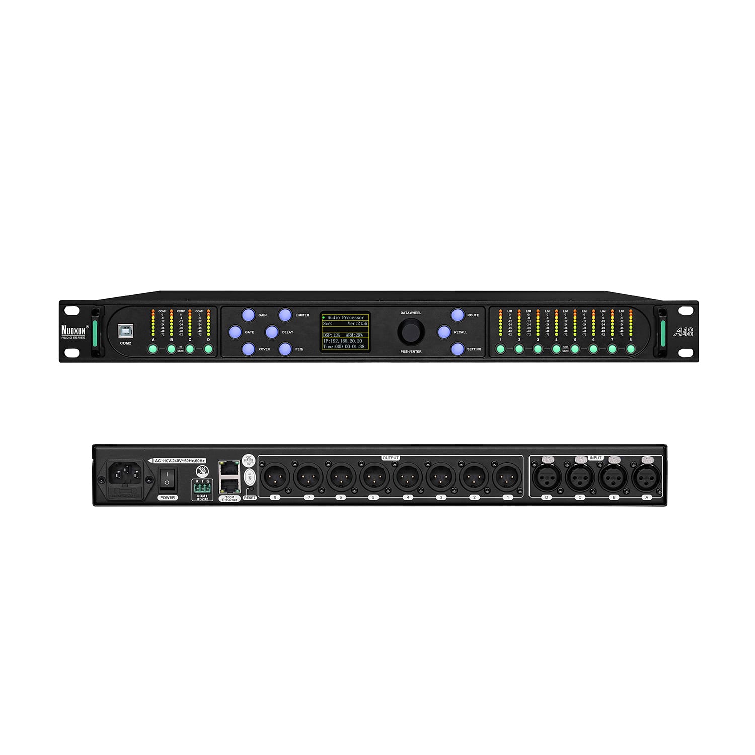 支持4路模拟输入,8路模拟输出。每路输入和输出通道支持13段参数均衡器、配有高低通滤波器、全通滤波器、信号发生器、噪声门、增益控制、