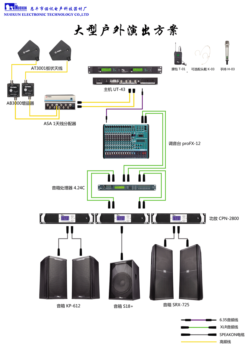诺讯为大型户外舞台演出工程提供如下解决方案:本套大型演出工程解决方案主要针对舞台的扩声,能够满足各类演出等使用。本套解决方案主要由一对单12寸全频音箱KP-612、一对单18寸超低音音箱S18+和一对双15寸全频音箱,同时搭配NPN-2000专业功放以及专业音箱处理器4.24C组成完美的扩声系统,通过不同扬声器相互叠加和覆盖,声音各频率均能得到良好的体现,使乐器和人声在表现上都能达到理想状态。