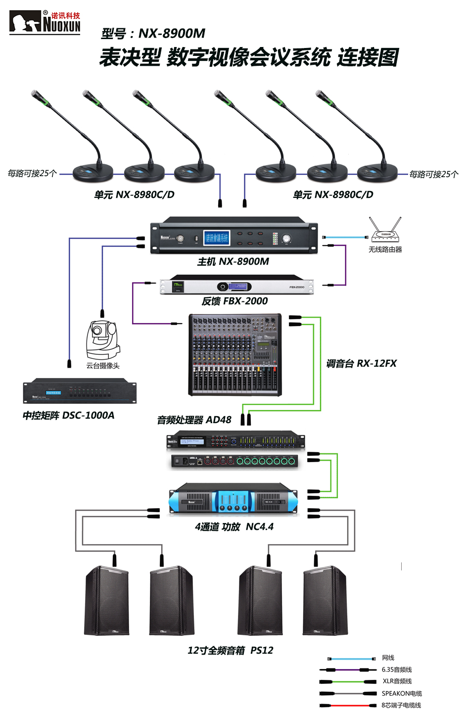 诺讯为数字视像会议系统提供以下音频系统解决方案,会议室推荐的组合是一台4通道功放,一台音频处理器AD48,一台调音台RX-12FX,一台反馈FBX-2000,一台中控矩阵DSC-1000,一台主机NX-8900M组成,采用有线会议系统主机连接NX-8988C/D或者-8980C/D会议单元,一套设备可接多个台会议单元,主席单元全面控制会议秩序,能够满足各种会议室扩音使用,效果令人满意。