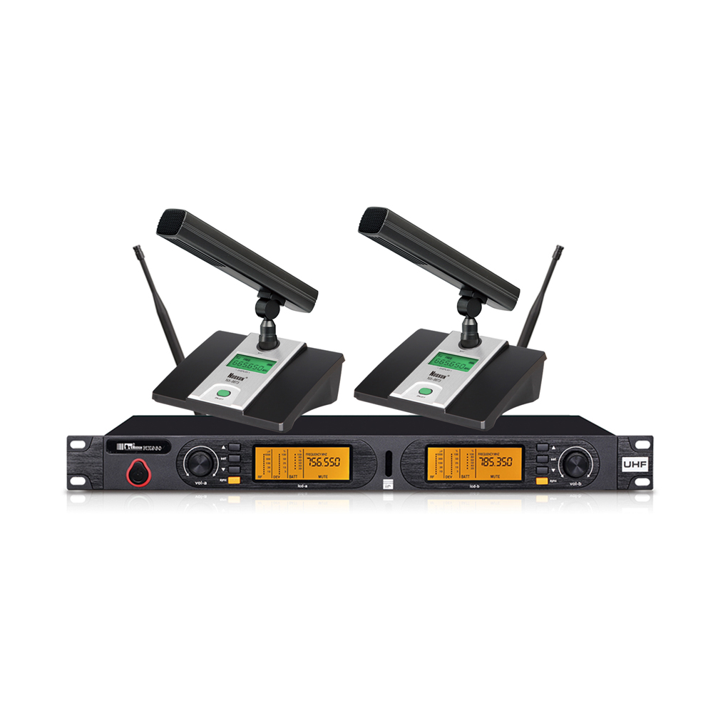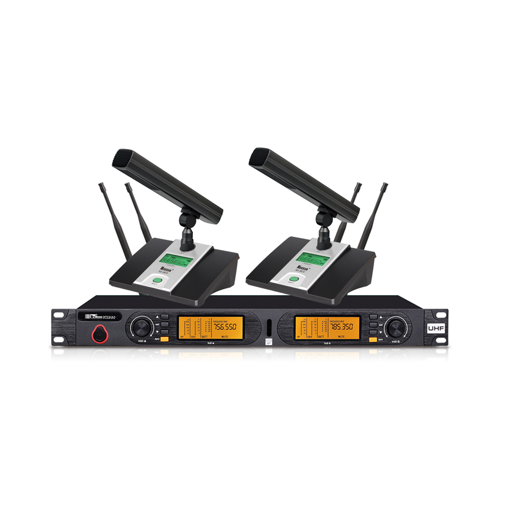 一拖二UHF无线麦克风产品特点:1.彩色TFT显示屏,新颖美观;彩屏显示功能:指示话筒编号与RF和AF信号强度、频率、输出音量设置、频道等工作状态.2.具有IR红外线自动对频功能,独立式的防误触系统锁键.3.二通道音量独立可调.4.提供多种发射器可选. 发射器有会议式/手持式···